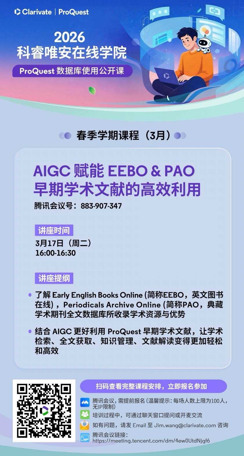 中山大学图书馆 > AIGC赋能EEBO&PAO早期学术文献的高效利用 AIGC赋能EEBO&PAO早期学术文献的高效利用 发布人:珠海校区图书馆-刘兰娜 发布日期:2026-03-10 活动时间 2026年03月17日 16:00 - 2026年03月17日 16:30 活动地点 线上 上述资料由科睿唯安数据库公司提供 分享