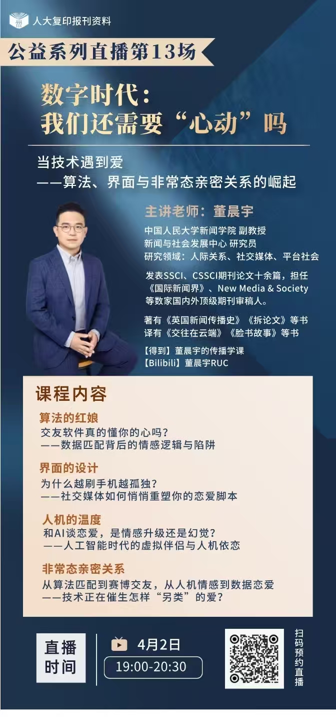 此次直播课分享聚焦数字时代下科技与人类情感的深度交汇。在平台社会的语境下,交友软件的算法逻辑、社交媒体的界面设计,乃至人工智能的普及,正在悄然重塑我们建立和维持亲密关系的方式。 讲座将从数字社会学的视角出发,探讨技术如何打破传统的恋爱脚本,催生出“非常态亲密关系”——无论是基于数据的算法匹配、人机之间的情感寄托,还是由界面规训的赛博交友。 本次活动特别邀请中国人民大学新闻学院董晨宇副教授作为主讲嘉宾,带我们一起剖析隐藏在代码背后的情感逻辑,反思技术在提供便利与陪伴的同时,如何重新定义了“爱”的本质。