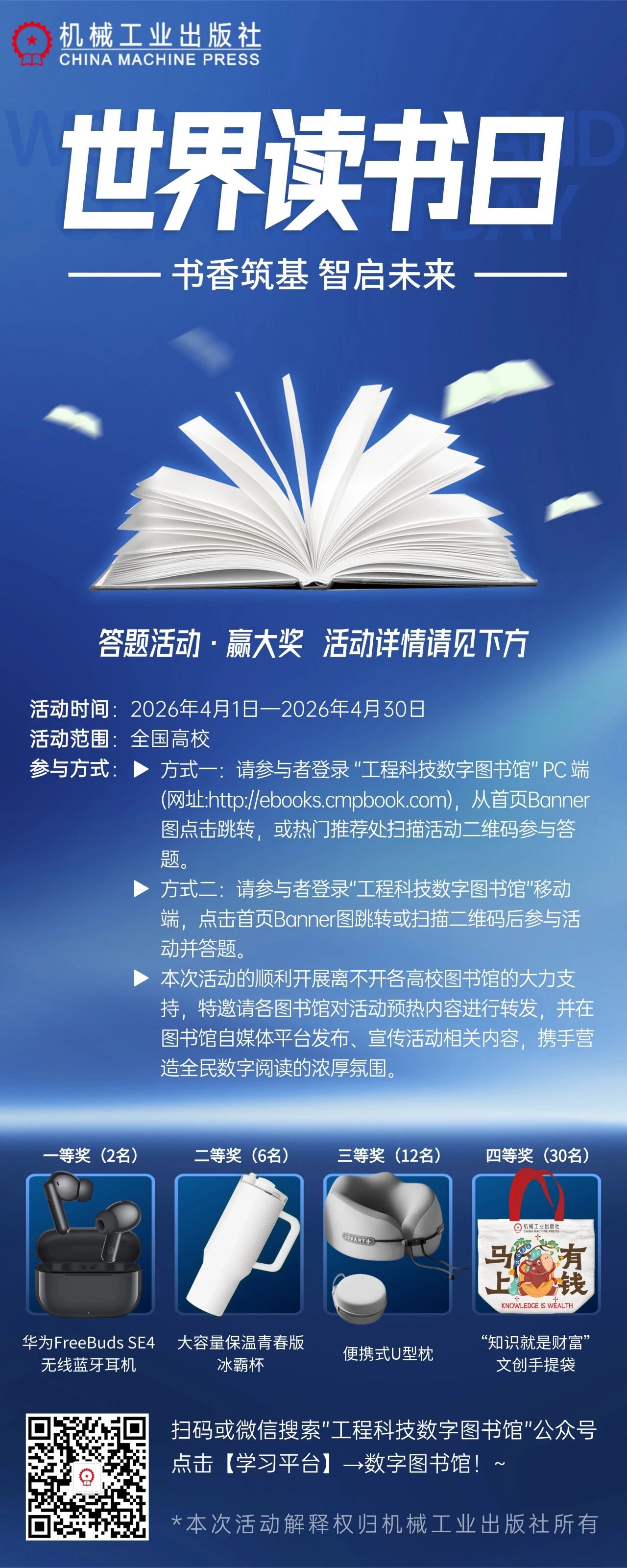 中山大学图书馆 > 工程科技数字图书馆“书香筑基 智启未来”系列活动一:有奖问答 工程科技数字图书馆“书香筑基 智启未来”系列活动一:有奖问答 发布人:深圳校区-袁方 发布日期:2026-04-13 活动时间 2026年04月01日 00:00 - 2026年04月30日 00:00 分享