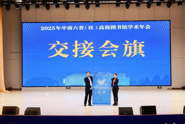 闭幕式上,会议总结环节圆满完成后,广西高等教育学会图书馆专业委员会秘书长庞蓓手持中南六省(区)高校图书馆学术年会会旗,郑重移交至湖南省高校图工委秘书长龚蛟腾手中,这一庄重的会旗交接仪式,不仅象征着本次年会的责任与使命顺利传承,更标志着2025年中南六省(区)高校图书馆学术年会正以昂扬的姿态进入新的未来。